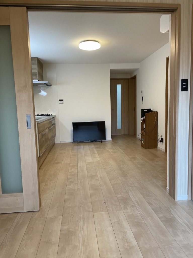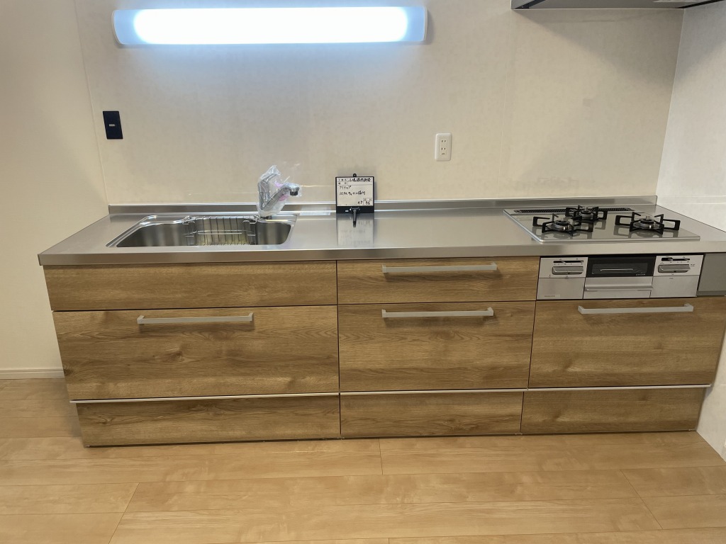 • システムキッチン。木目のパネルが部屋と調和しています。